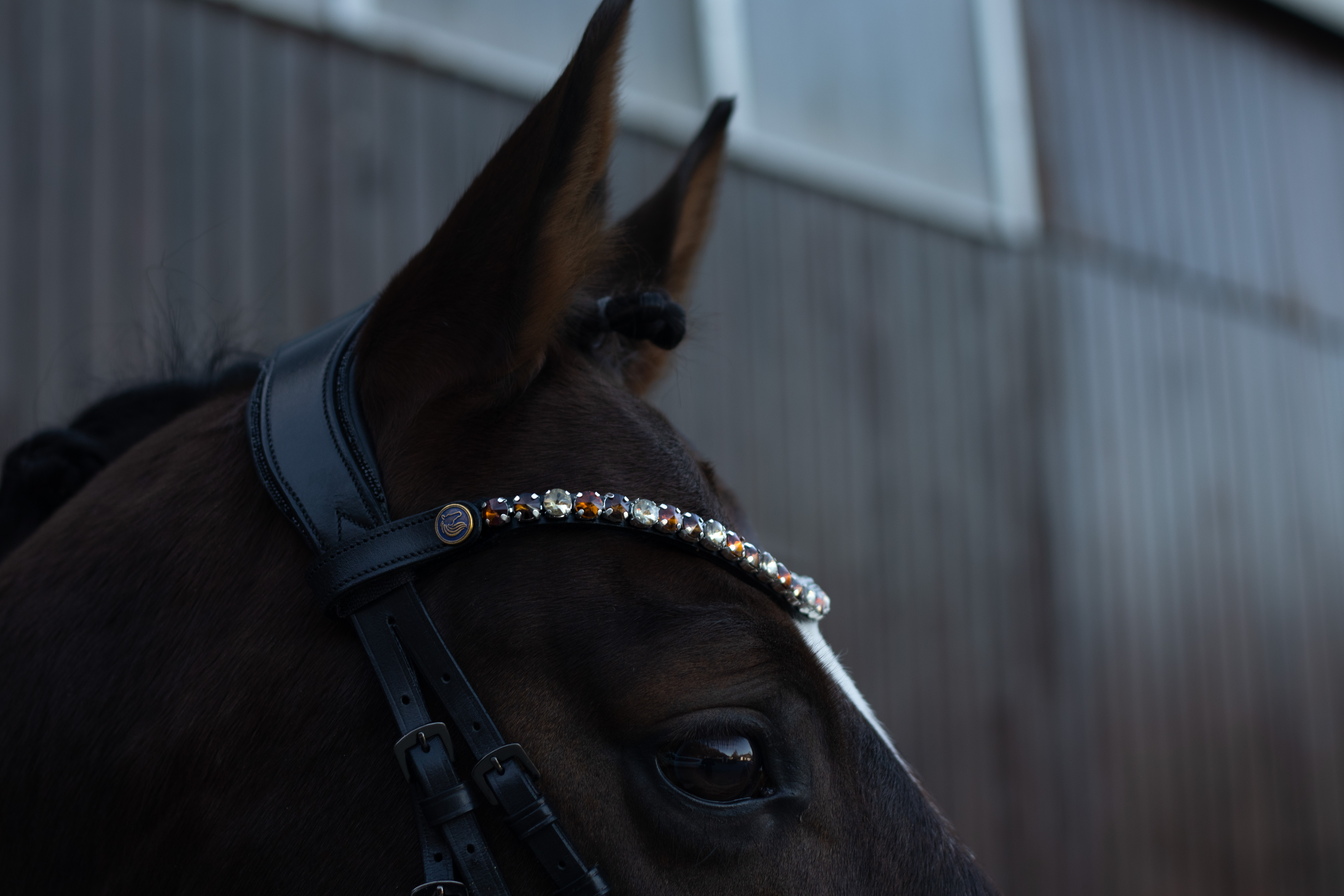 Der Stirnriemen Iced Coffeee vereint warme Kaffeetöne mit kristallklarem Glanz. Handgesetzte STELLUX™-Steine in cappuccinofarbenen Nuancen funkeln wie Eiskristalle im Morgenlicht – für einen edlen, natürlichen Look, der jedes Pferd strahlen lässt.