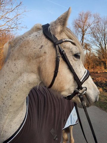 Paddy war von Anfang an sehr begeisterst von seiner neu gewonnenen Ohrenfreiheit. Beim Reiten lässt er die Ohren richtig locker und bewegt sie sehr viel, ohne das sie über die Trense knubbeln. Für uns ist der abnehmbare Sperrriemen super gut. Wir reiten ohne und es fällt gar nicht auf, dass dort noch Platz für einen Sperrriemen wäre, aber ich habe immer die Möglichkeit ihn wieder einzubauen, falls wir ihn doch irgendwann mal brauchen sollten.