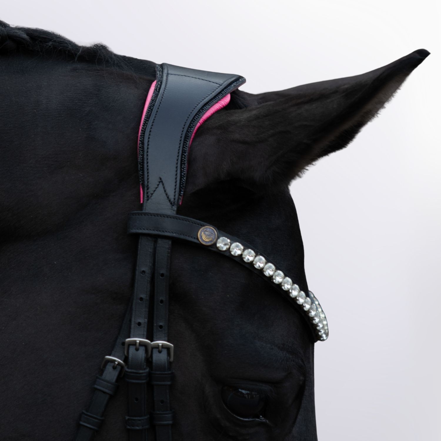 Midnight Glow – subtle looks, serious comfort. If you want crisp lines, a horse-friendly fit and a sleek, modern finish, Midnight Glow delivers. Its anatomical shape and black hardware elevate your bridle with minimalist elegance and everyday performance. Comfort & Design – soft feel, smart shape Generous padding distributes pressure evenly and protects sensitive facial areas. The contoured profile frees the jaw for a relaxed connection and lighter aids. Key Features Anatomically shaped for targeted pressure relief Black hardware for a clean, modern aesthetic Soft, durable padding for daily comfort Fine adjustability for a precise, individual fit Hand-finished edges and stitching for smooth transitions Built to last Handcrafted from vegetable-tanned premium leather—supple, durable and naturally beautiful. Every detail is engineered for longevity and your horse’s comfort. Fast shipping Usually ships within 1–2 business days. Level up your bridle Treat your horse to real comfort and add a timeless accent to your tack—get Midnight Glow now. Competition note: Eligibility varies by discipline and adjustment. Please check the current rulebook.